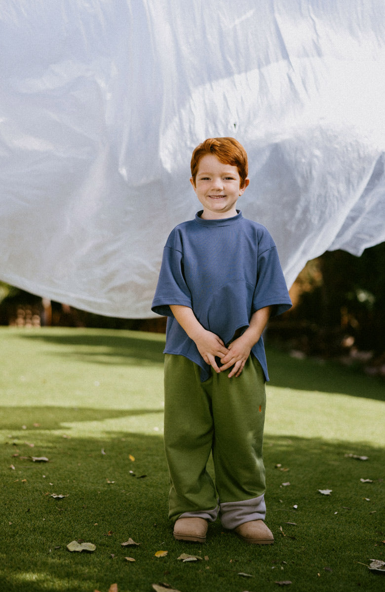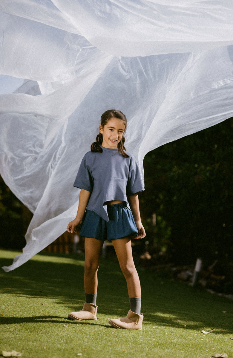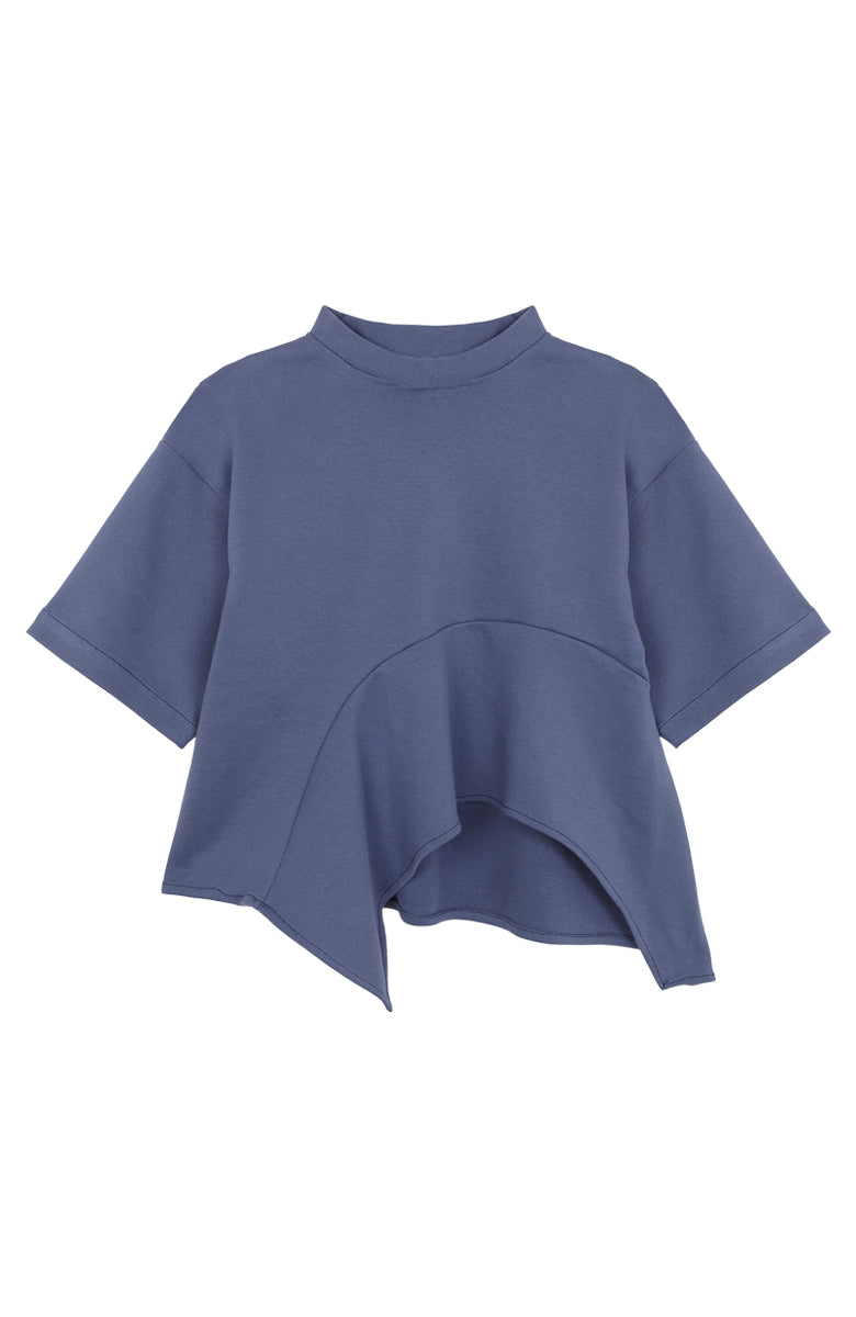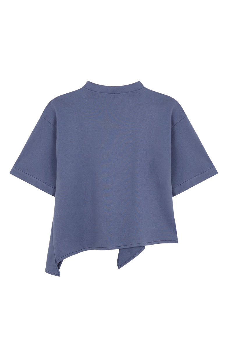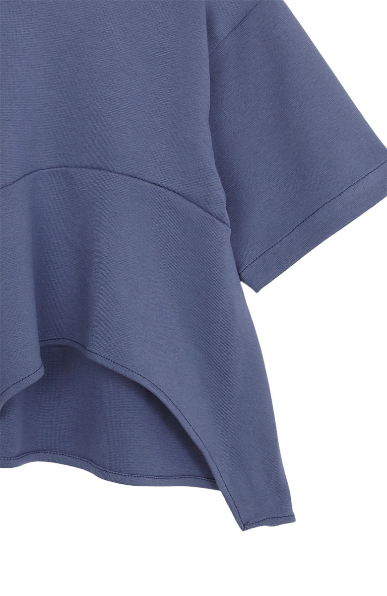 T-shirt de manga corta en color serenity, con cuello Perkins y corte asimétrico en el bajo decorado con un volante.