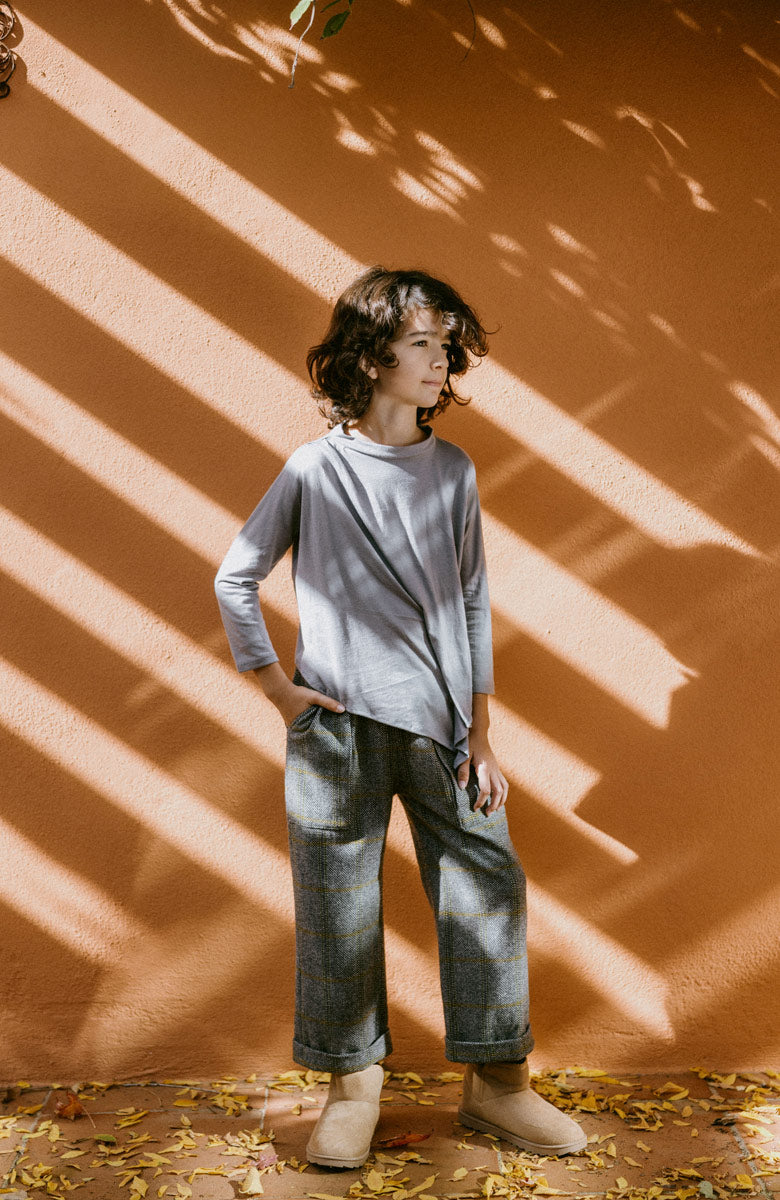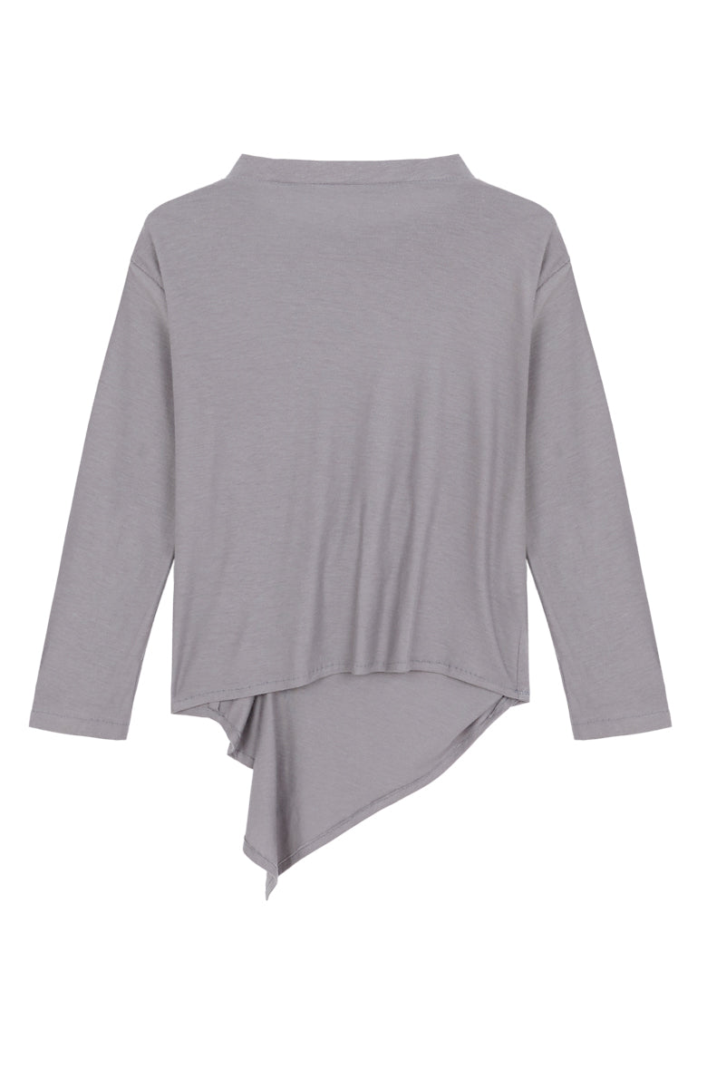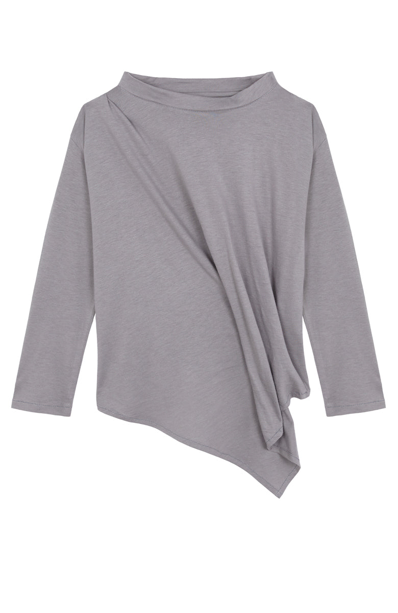 Camiseta en punto color piedra, con manga larga y detalle de pliegue delantero.