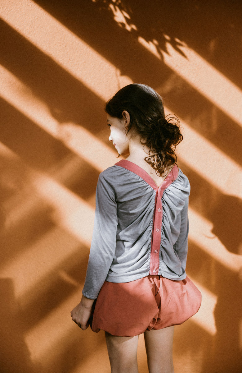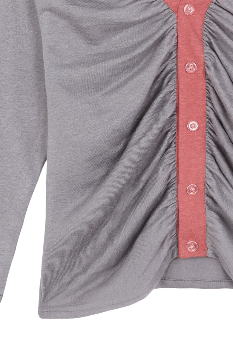 Camiseta reversible con abotonadura drapeada, en punto en colores piedra y frambuesa combinados.