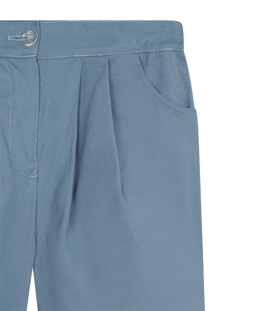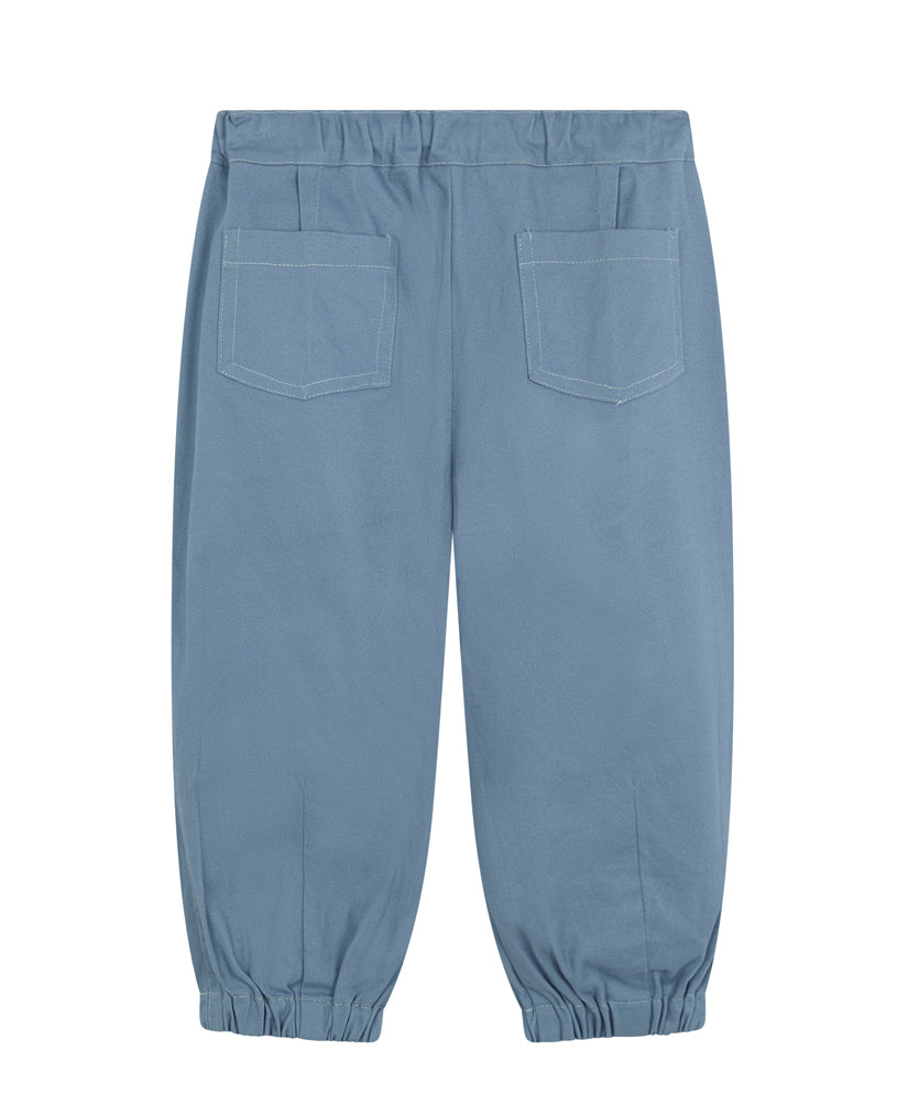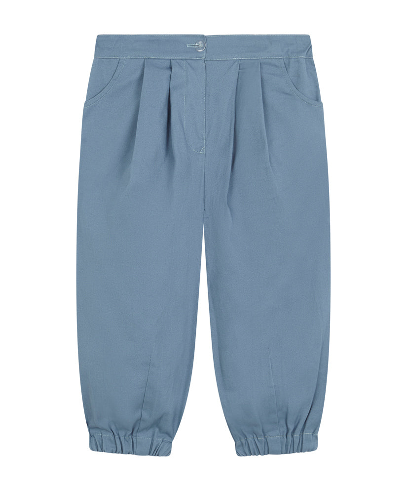 El pantalón consigue su volumen gracias a el tableado delantero y la goma en los bajos.Tiene bolsillos a los laterales y en la parte trasera. Está confeccionado en tafetán de algodón color serenity.