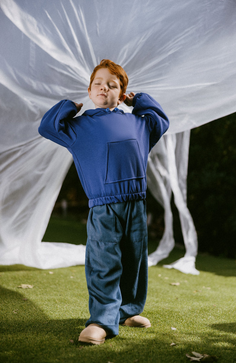 Sudadera en felpa de algodón color Klein, con capucha con gomas finas para regular y bolsillo frontal